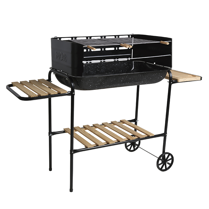 Su tabla de madera permite cortar fácilmente los alimentos y dar soporte a su bebida. Sus pies de tubo de acero hacen que el producto sea firme y seguro. Las ruedas ayudan al transporte y el cuerpo en chapa de acero esmaltado garantiza un producto de gran durabilidad. Para hacerlo aún más fácil, viene con una parrilla con mango de madera, tres brochetas simples de 58 cm y una brocheta doble de 58 cm.
